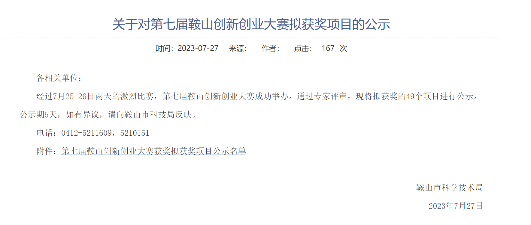 7月27日,鞍山市科技局发布公告,公司在第七届鞍山创新创业大赛中荣获三等奖,并将代表鞍山市参加今年的辽宁省创新创业大赛。