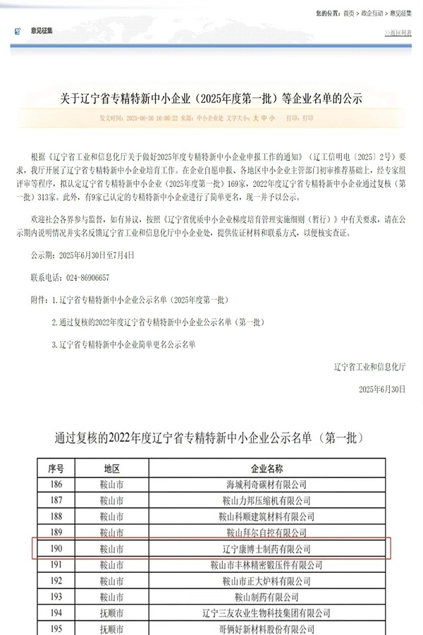 6月30日,辽宁省工业和信息化厅发布“关于辽宁省专精特新中小企业(2025年度第一批)等企业名单的公示”,辽宁康博士制药有限公司通过“辽宁省专精特新中小企业”复核。