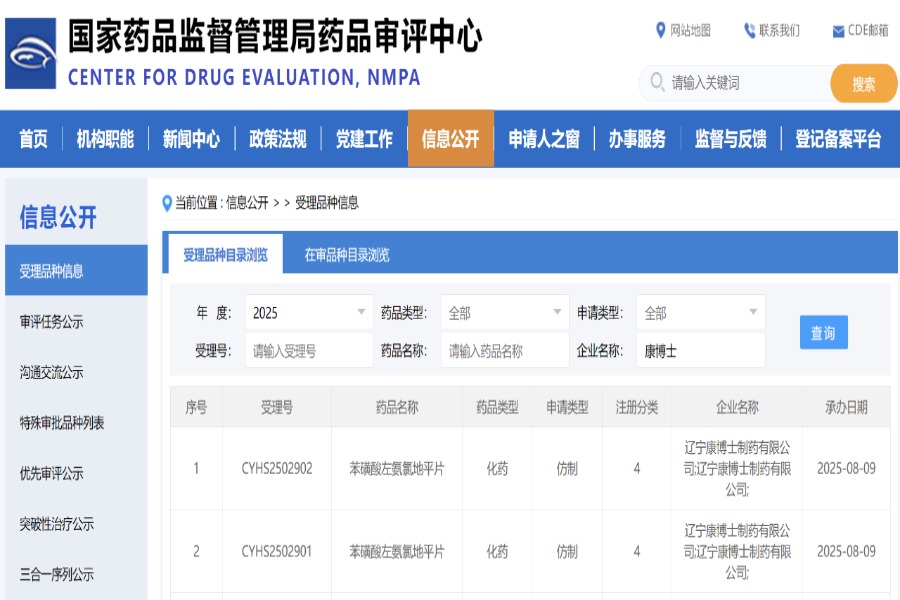 8月8日,辽宁康博士制药有限公司收到国家药品监督管理局签发的《受理通知书》,苯磺酸左氨氯地平片(规格:按左氨氯地平计2.5mg、5mg)注册上市许可申请获得受理。